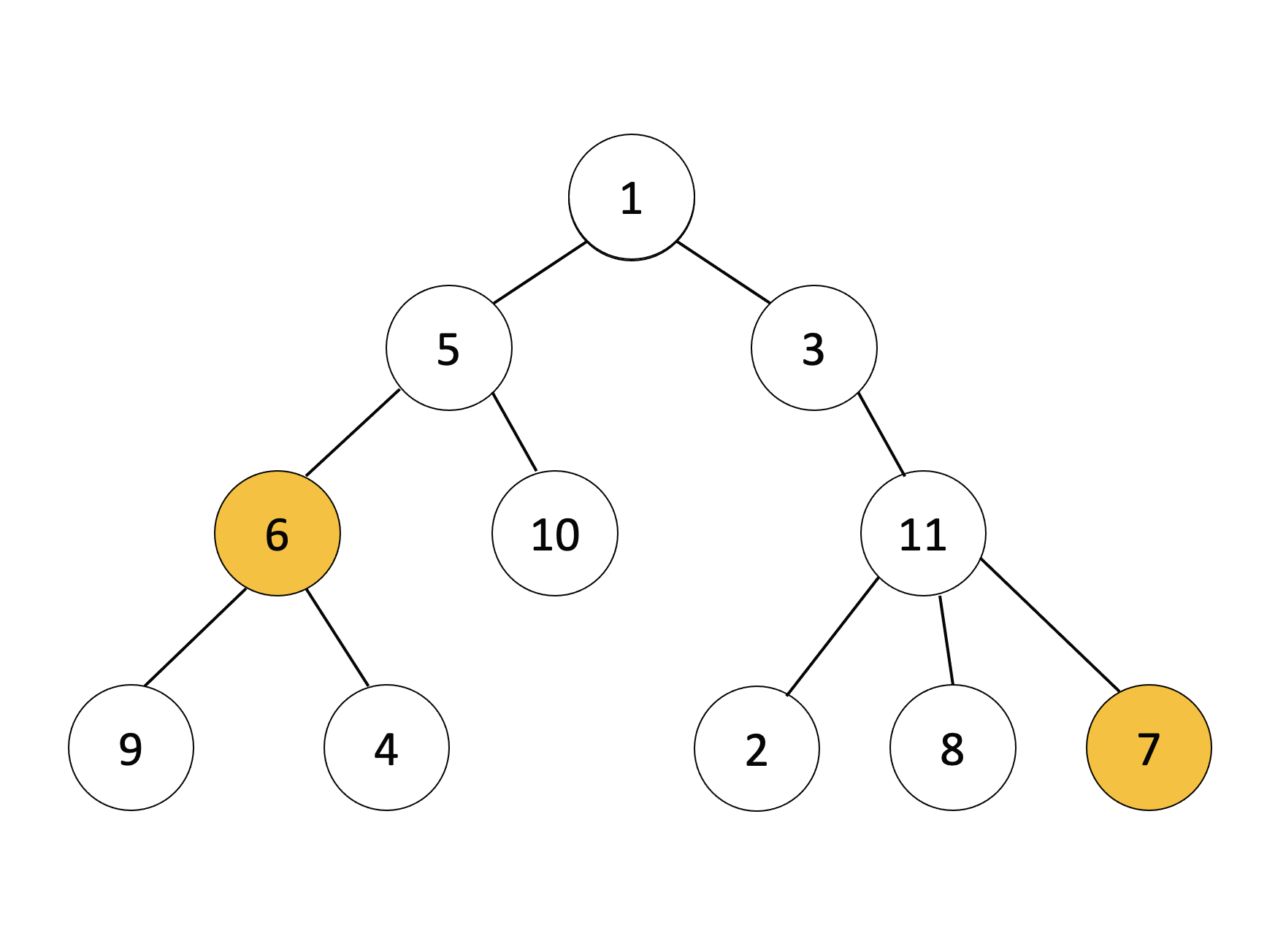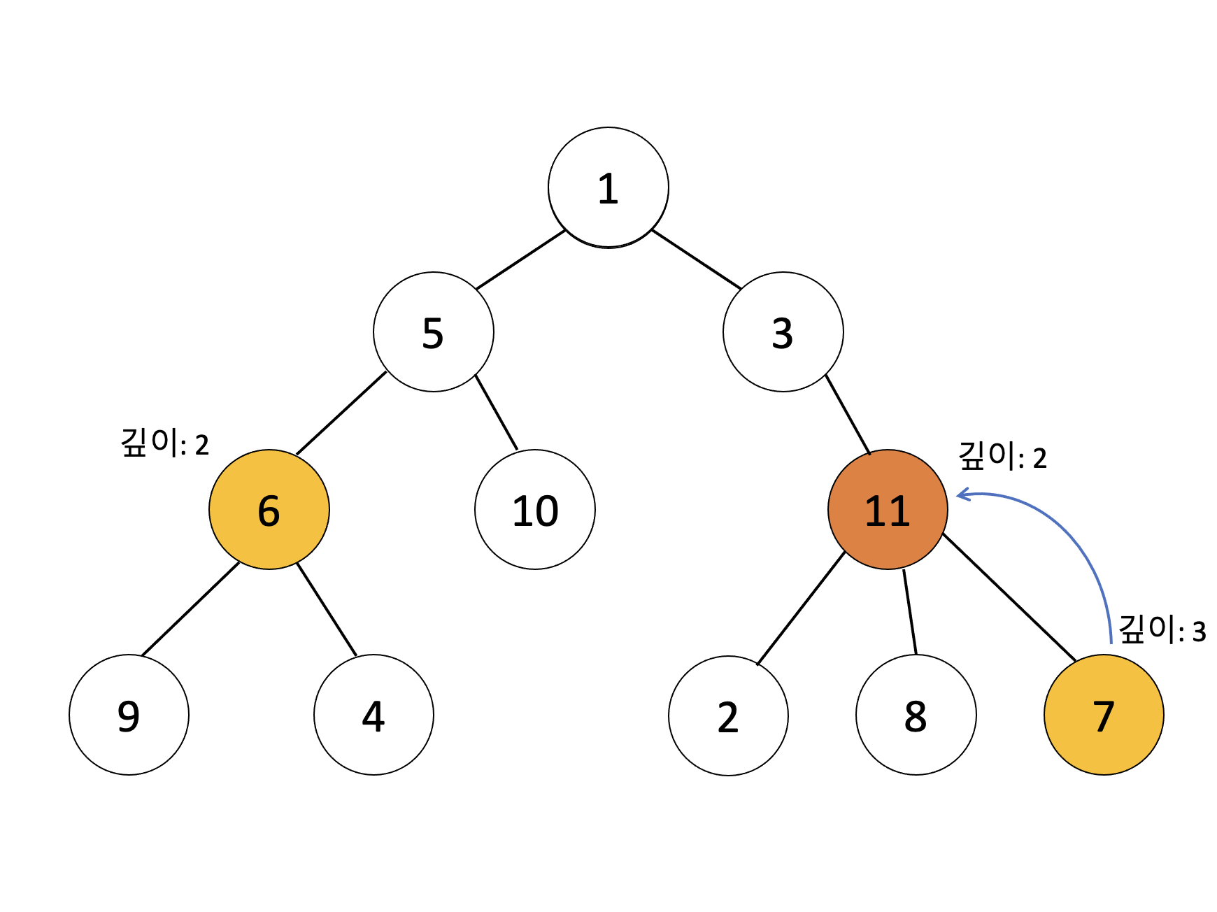 1. \(a\)와 \(b\)중 깊이가 더 깊은 노드를 깊이가 더 얕은 노드의 깊이와 같게 해줍니다. (이때, 깊이가 더 깊은 노드를 \(2^{log_{2}N}\)번째, \(2^{log_{2}N-1}\)번째, \(2^{log_{2}N-2}\)번째, ... , \(2^0(=1)\)번째 순서로 조상을 보면서 깊이가 같아질 때까지 조상을 타고 올라갑니다.)