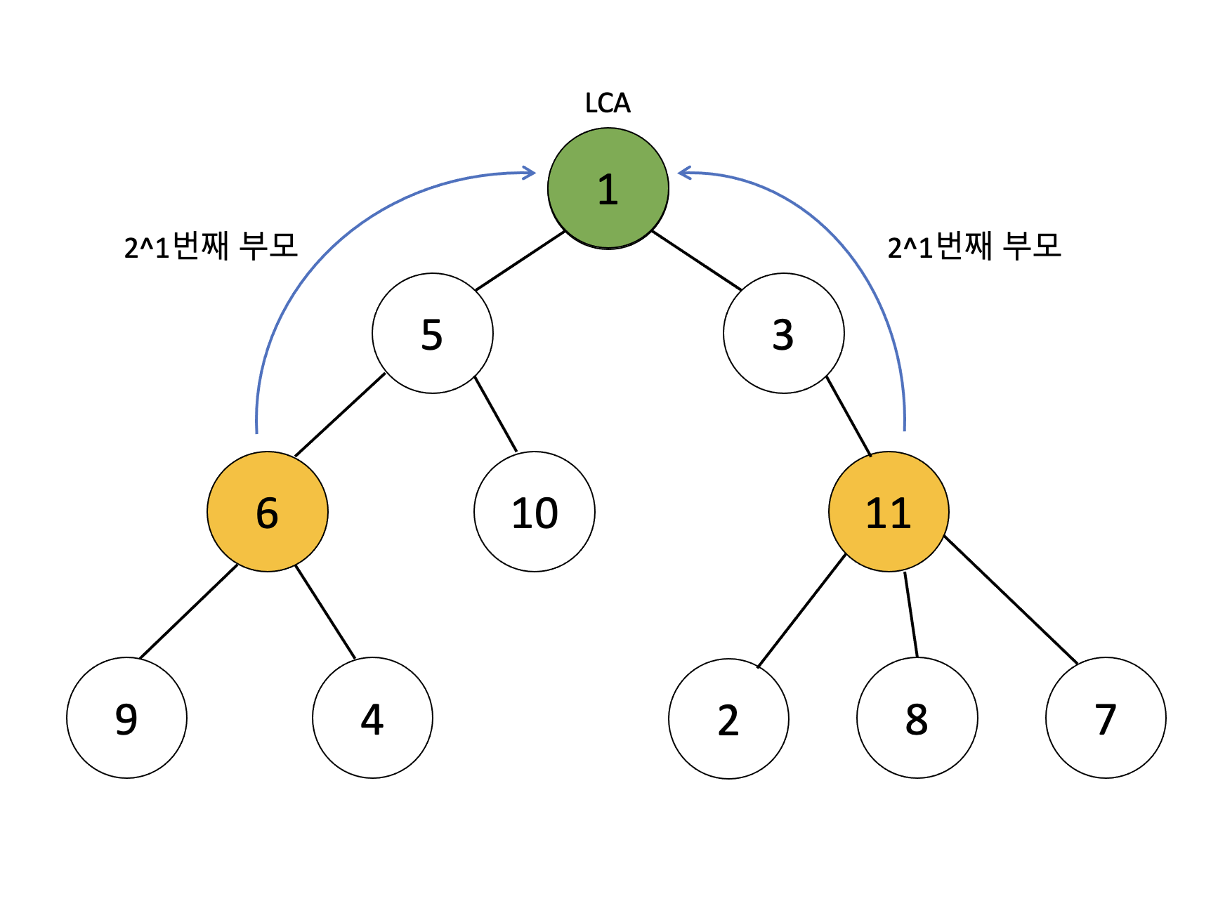2. 서로의 노드가 같아질 때까지 \(2^{log_{2}N}\)번째, \(2^{log_{2}N-1}\)번째, \(2^{log_{2}N-2}\)번째, ... , \(2^0\)번째 순서로 서로의 조상들을 타고 올라갑니다.